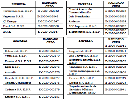Durante el periodo de consulta se recibieron comentarios por parte de los agentes que se listan a continuación, a través de los siguientes radicados: