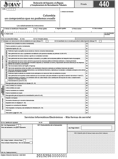 ARTÍCULO 2o. FORMULARIO NÚMERO 440. <Para el año 2017 Resolución 13 de 2017> Prescribir para la presentación de la “Declaración del Impuesto a la Riqueza y Complementario de Normalización Tributaria”, correspondiente al año gravable 2015, el Formulario Modelo número 440, diseño que hace parte integral de la presente resolución. El número preimpreso inicia con 2015.