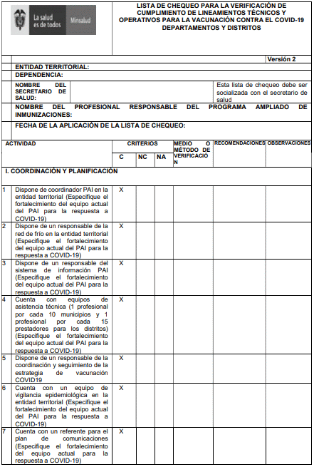 Anexo 4: Lista de chequeo para la verificación de cumplimiento de actividades a nivel departamental, distrital y municipal, prestadores de servicios de salud y entidades responsables del aseguramiento.