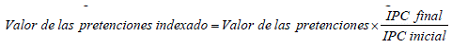 ARTÍCULO 6o. INDEXACIÓN DE LAS PRETENSIONES. <Resolución derogada por el artículo 19 de la Resolución 2702 de 2025> Con el fin de indexar el valor de las pretensiones de la demanda a la fecha actual, se debe dividir el Índice de Precios al Consumidor (IPC), certificado por el Departamento Administrativo Nacional de Estadística (DANE) para el mes inmediatamente anterior a la fecha presente, entre el IPC certificado por el DANE para el mes en el cual se presentó la demanda. La cifra resultante se multiplica por el valor de las pretensiones que se pretenden actualizar. El resultado es el valor indexado de las pretensiones de la demanda. Para este procedimiento, se debe tener en cuenta la siguiente ecuación: