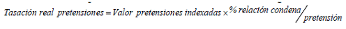 ARTÍCULO 7o. TASACIÓN REAL DE LAS PRETENSIONES. <Resolución derogada por el artículo 19 de la Resolución 2702 de 2025> Para hacer la tasación real de las pretensiones, cuando están sobreestimadas o subestimadas por el actor, según sea el caso, el apoderado debe multiplicar el valor de las pretensiones indexadas – indicado en el paso anterior- por el valor resultante de la relación condena/pretensión de ese tipo de proceso. La relación condena/pretensión se calcula mediante la división del valor histórico de condena entre el valor histórico de pretensiones o por su disminución o aumento porcentual; valores establecidos conforme al criterio del apoderado y a bases estadísticas que se encuentran en el Sistema de Información Litigiosa e-Kogui y en el aplicativo CRM Microsoft Dynamics. El valor que se obtiene al realizar el anterior procedimiento corresponde a la pretensión ajustada. Para realizar este procedimiento, debe tenerse en cuenta la siguiente ecuación: