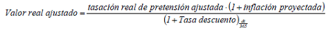 ARTICULO 8o. VALOR REAL AJUSTADO. <Resolución derogada por el artículo 19 de la Resolución 2702 de 2025> El apoderado debe calcular la duración probable del proceso judicial o arbitral, desde la fecha de admision de la demanda a proyectar el valor que debera pagar la entidad en la fecha estimada de finalización del proceso, utilizando como base la tasación real de pretensiones, valor obtenido anteriormente y traerlo a valor presente aplicando la siguiente fórmula: