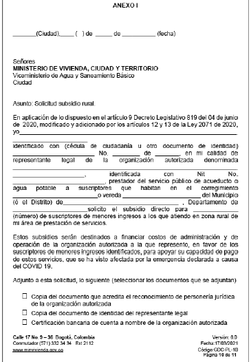 1. Diligenciar los formatos dispuestos en la página web del Ministerio de Vivienda, Ciudad y Territorio (www.minvivienda.gov.co), anexos a la presente resolución, los cuales están disponibles en el enlace “SUBSIDIO RURAL”.