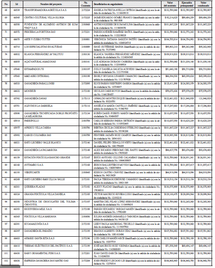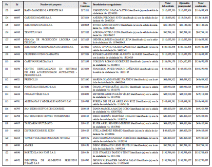 ARTÍCULO 1o. DECISIÓN. Condonar los recursos asignados a ciento veintitrés (123) planes de negocio beneficiados con el Capital Semilla del Fondo Emprender, en la cuantía indicada en la tabla que se relaciona a continuación y atendiendo el informe rendido por la Empresa Nacional Promotora del Desarrollo Territorial (ENTerritorio), en su calidad de gerente administrador de los recursos, el cual hace parte de la presente resolución, y las actas e informe final de interventoría realizado por las Universidades de Antioquia y del Valle, de cada uno de los planes de negocio, los cuales acreditan el cumplimiento de los indicadores de gestión acordados en cada plan de negocio aprobado inicialmente por el Consejo Directivo Nacional del Sena y elevados a contrato.