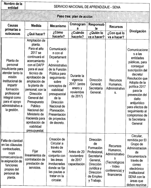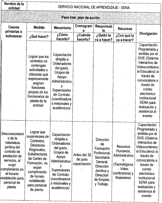 La Secretaría General con el fin de mitigar una de las causas primarias “falta de personal de planta” realizará los acercamientos con la Función Pública y el Ministerio de Trabajo, con la Dirección General de Presupuesto y con el Ministerio de Hacienda para obtener el presupuesto necesario para la ampliación de la planta del SENA y la consecución de la firma de decretos necesarios por parte del Ejecutivo.