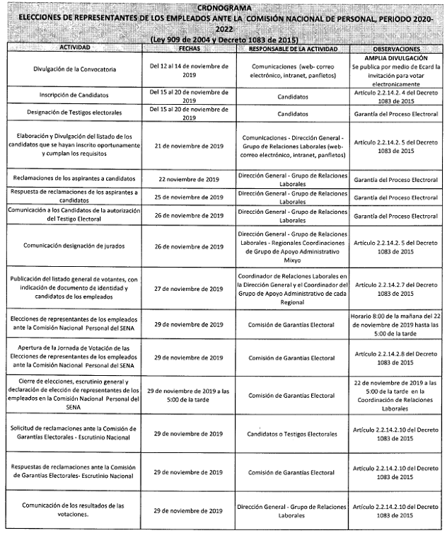 Que los actuales representantes de los empleados ante la Comisión Nacional de Personal, terminan su periodo el 22 de enero de 2020, siendo necesario convocar a elecciones para elegir a los representantes de los empleados públicos ante la Comisión Nacional de Personal del SENA por el periodo 2020-2022, así como disponer el mecanismo para la realización de las elecciones y el cronograma para la ejecución del proceso electoral.