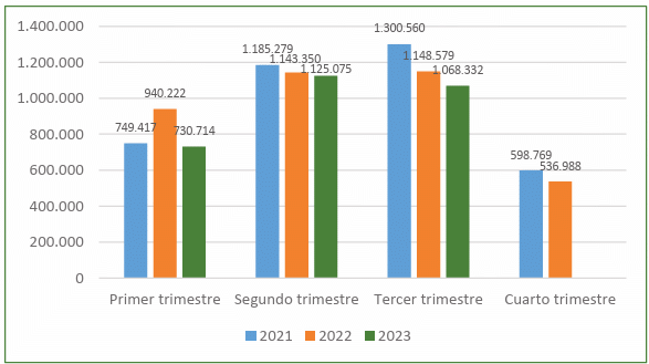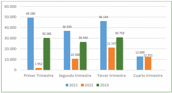 En ese orden de ideas, el SENA ha fortalecido los procesos de formación en las modalidades de titulada y complementaria, teniendo un aumento de aprendices formados en cada trimestre, es así, como el número de aprendices por formación virtual por trimestre para los años 2021, 2022 y 2023 se muestran en la gráfica No. 1: