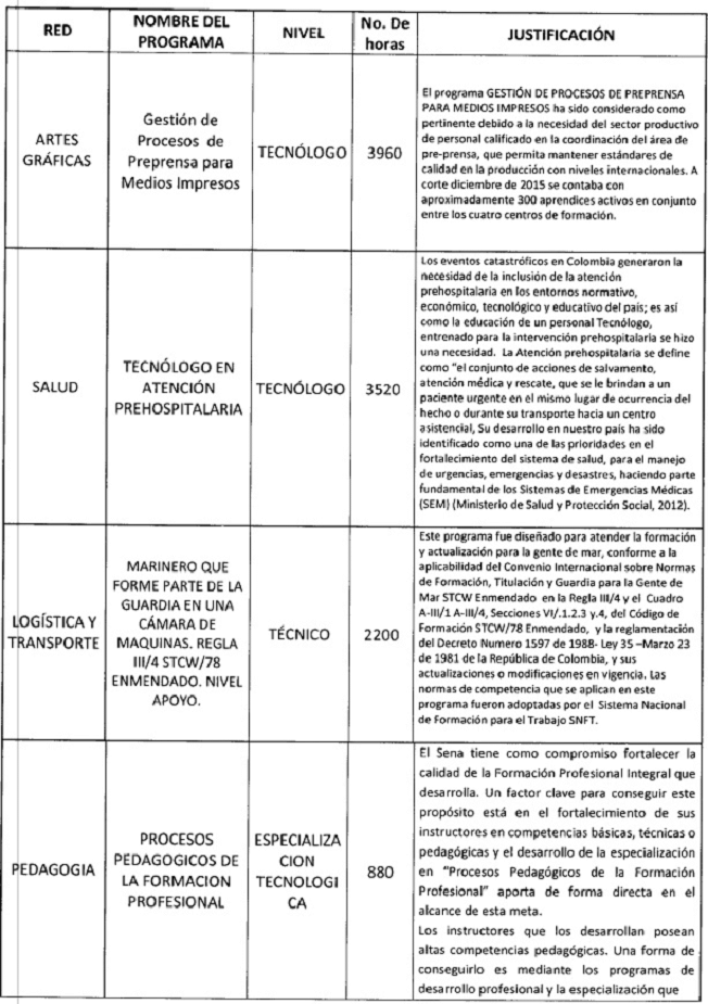 Que el 12 de marzo de 2014 se expidió la resolución 0472, el 9 de mayo de 2014; se expidió la resolución 0871, el 30 de julio de 2014; se expidió la resolución 01603, el 4 agosto de 2014; se expidió la resolución 01648; se expidió la resolución 1439 de Julio de 2015; el 08 de Octubre de 2015; se expidió la resolución 2024. Así con las necesidades detectadas a través del análisis realizado por las redes de conocimientos las cuales se aprueban programas de formación profesional integral, y que de acuerdo al mismo se emitieron las resoluciones 1042 y 1044 del 08 de junio de 2016; por las conocimiento para dar respuesta al sector productivo, se hace necesario ampliar la rta educativa, según consta en el acta No. 12 del 26 de Julio de 2016 y en el Acta.. 13 del 30 de Agosto de 2016; del Comité Nacional de Formación Profesional.