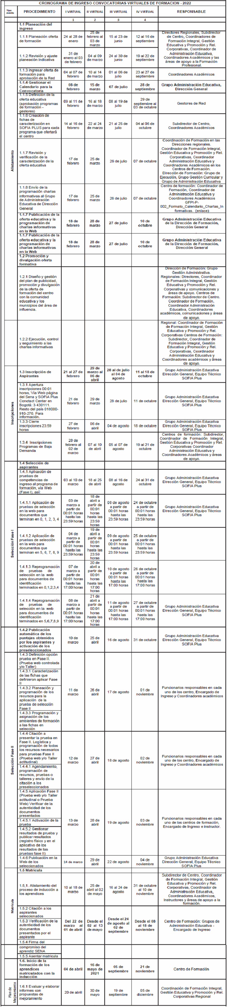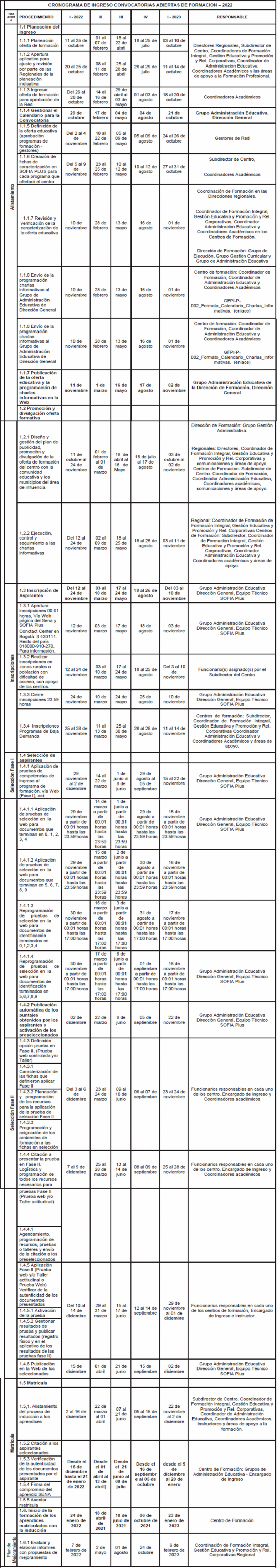 ARTÍCULO 4o. Los Centros de Formación Profesional Integral contarán para su programación, con el cronograma de ingreso de las convocatorias abiertas de formación para el año 2022 el cual se anexa. Como mínimo se establecen cuatro (4) convocatorias de formación laboral y tecnológica presencial y a distancia, cuatro (4) convocatorias de formación laboral y tecnológica virtual, pero se debe tener en cuenta los cambios que puedan surgir al cronograma de ingreso para efecto de programar a nivel nacional más convocatorias por requerimientos del sector productivo y social, previa evaluación y aprobación de la Dirección de Formación Profesional Integral de la Dirección General.