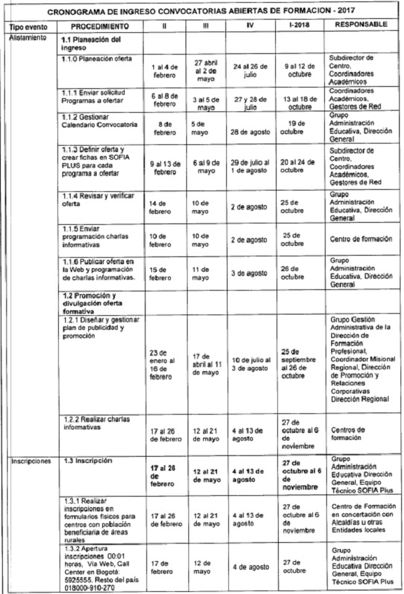 ARTICULO 1o. <Artículo modificado por el artículo 1 de la Resolución 732 de 2017. El nuevo texto es el siguiente:> Establece el siguiente calendario académico y de labores para los Centros de Formación Profesional del SENA, correspondiente al año 2017: