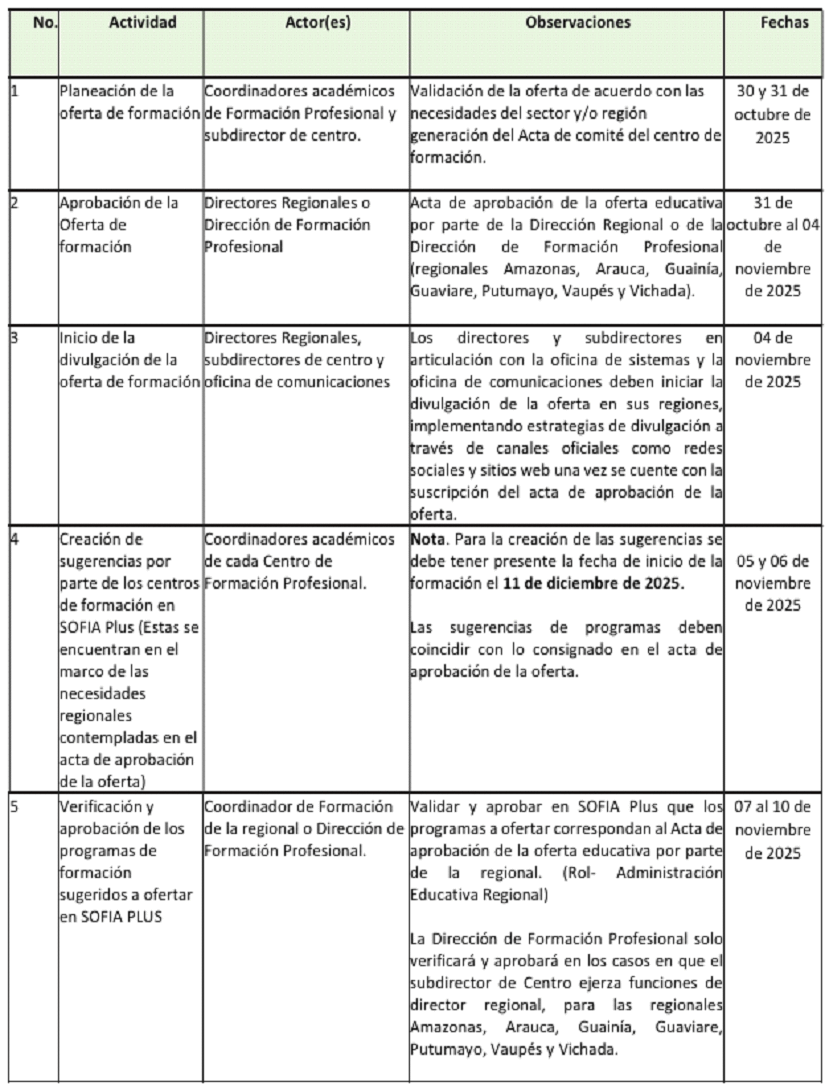 "ARTÍCULO 3. CRONOGRAMA PARA EL DESARROLLO DE LA CONVOCATORIA. Los Centros de Formación Profesional Integral deberán cumplir el cronograma de la quinta convocatoria de formación abierta presencial y a distancia para programas tecnológicos de la vigencia 2025 en especial lo establecido en las fechas de las matrículas para garantizar que estas se realicen durante la vigencia del registro calificado de los programas de formación. Lo anterior está definido en el Anexo 2 denominado "Cronograma de Ingreso quinta Convocatoria Abierta Presencial y a Distancia programas tecnológicos 2025", los cuales hacen parte integral de la presente Resolución".