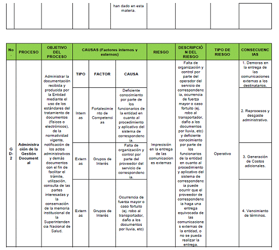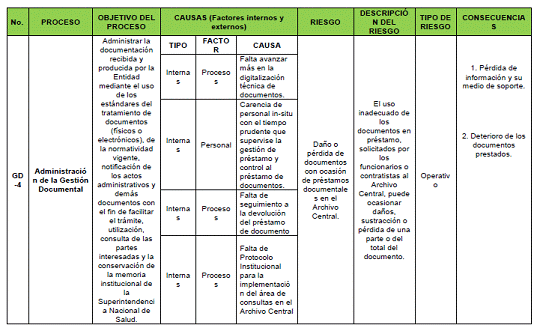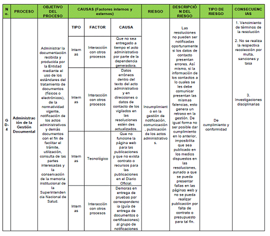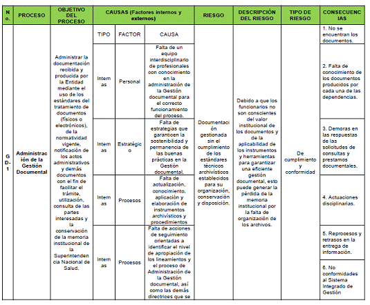 Que el Grupo de Gestión Documental de la Subdirección Administrativa, es el encargado de apoyar en la formulación de políticas, procesos y procedimientos relacionados con la Gestión Documental de la Superintendencia Nacional de Salud; dirigir y supervisar la ejecución, monitoreo, control y mejoramiento de los procedimientos de Gestión Documental de la Entidad; apoyar la implementación y sostenibilidad del Sistema de Gestión Institucional y sus componentes; entre otros.[3]